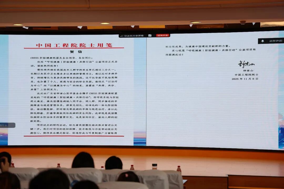 刘浚哲组长现场宣读了钟南山院士的贺信。钟院士在贺信中指出:“慢性病共病在我国成年人群中的发生率已超过三分之一。长期以来医疗卫生服务多以单病种管理为主,难以应对多病并存、持续增长与复杂共病带来的挑战。”他强调,此次公益项目将呼吸系统与肝脏两大高发慢性病纳入同平台筛查体系,是我国慢性病综合防治体系的重要创新,并详细介绍了呼吸健康万人筛查公益项目。