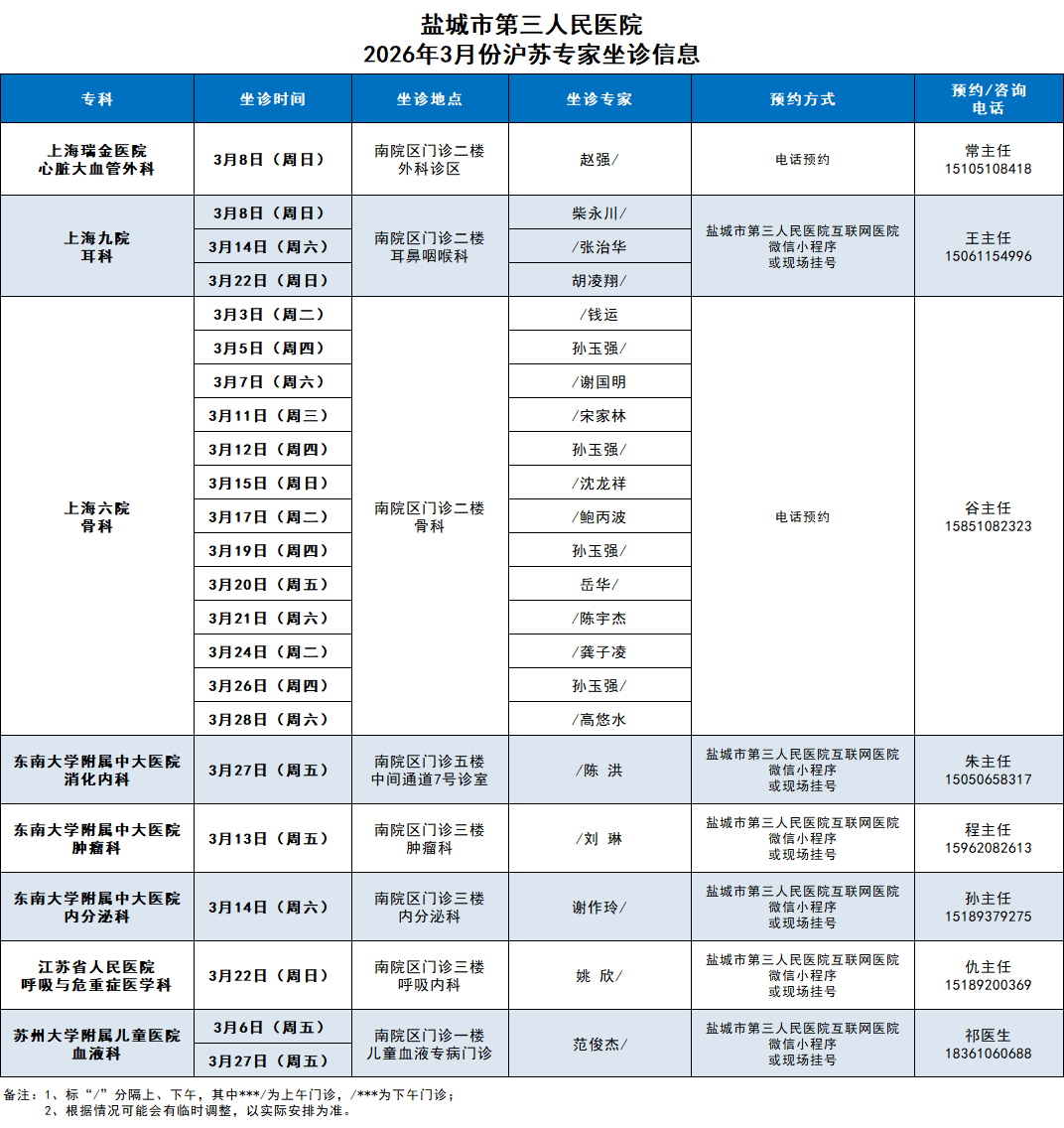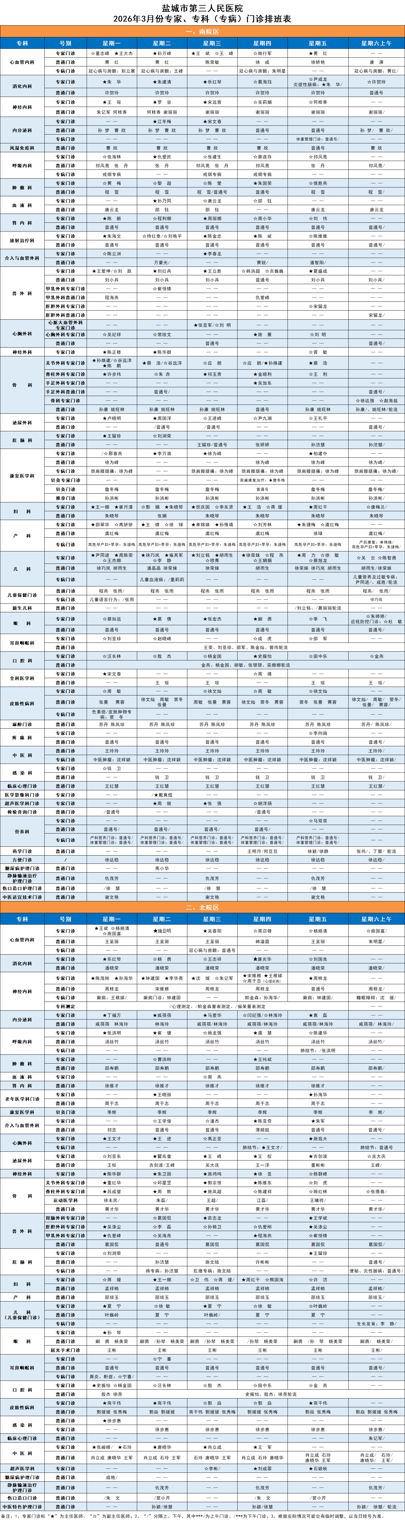 专家门诊排班表 首页 > 就医指南 > 门急诊指南 > 门诊排班 > 专家门诊排班表 > 正文 盐城市第三人民医院专家门诊排班表(2026年3月) 信息来源: 日期: 2026-02-28浏览: 门诊一站式服务台: 0515-81600080(南院区) 0515-81608266(北院区) 敬老专线: 0515-81602286(南院区) 0515-81608123(北院区)