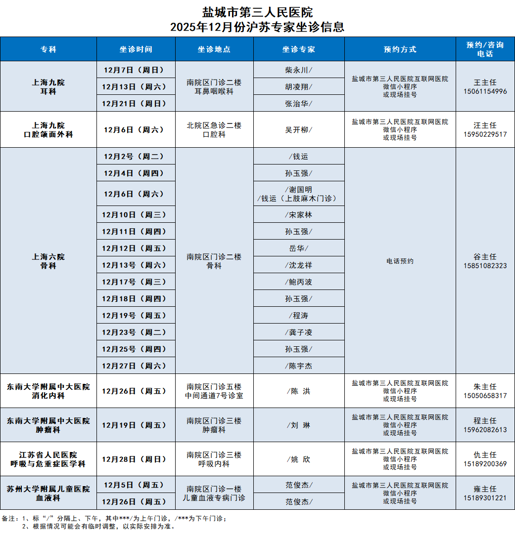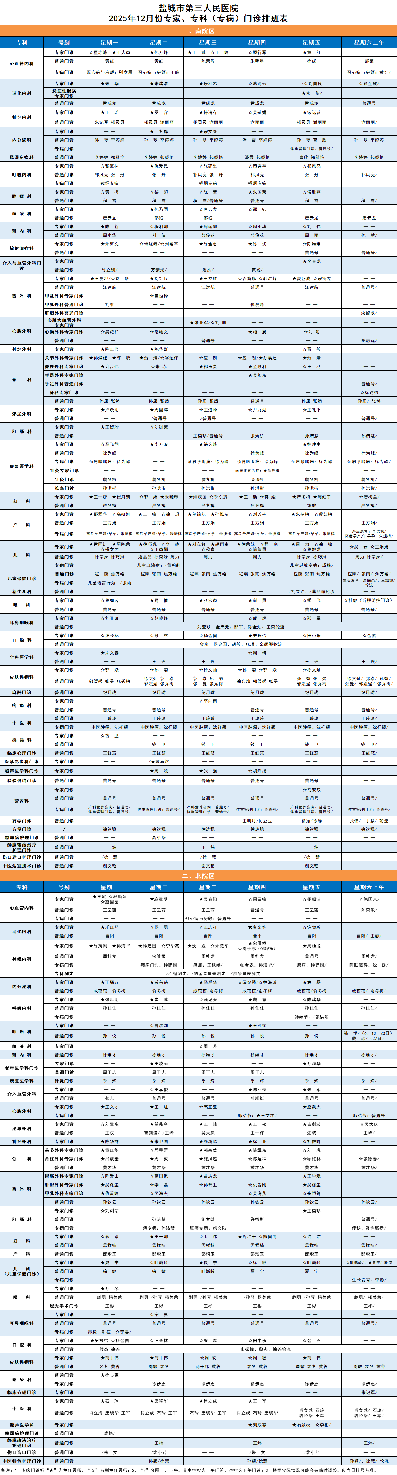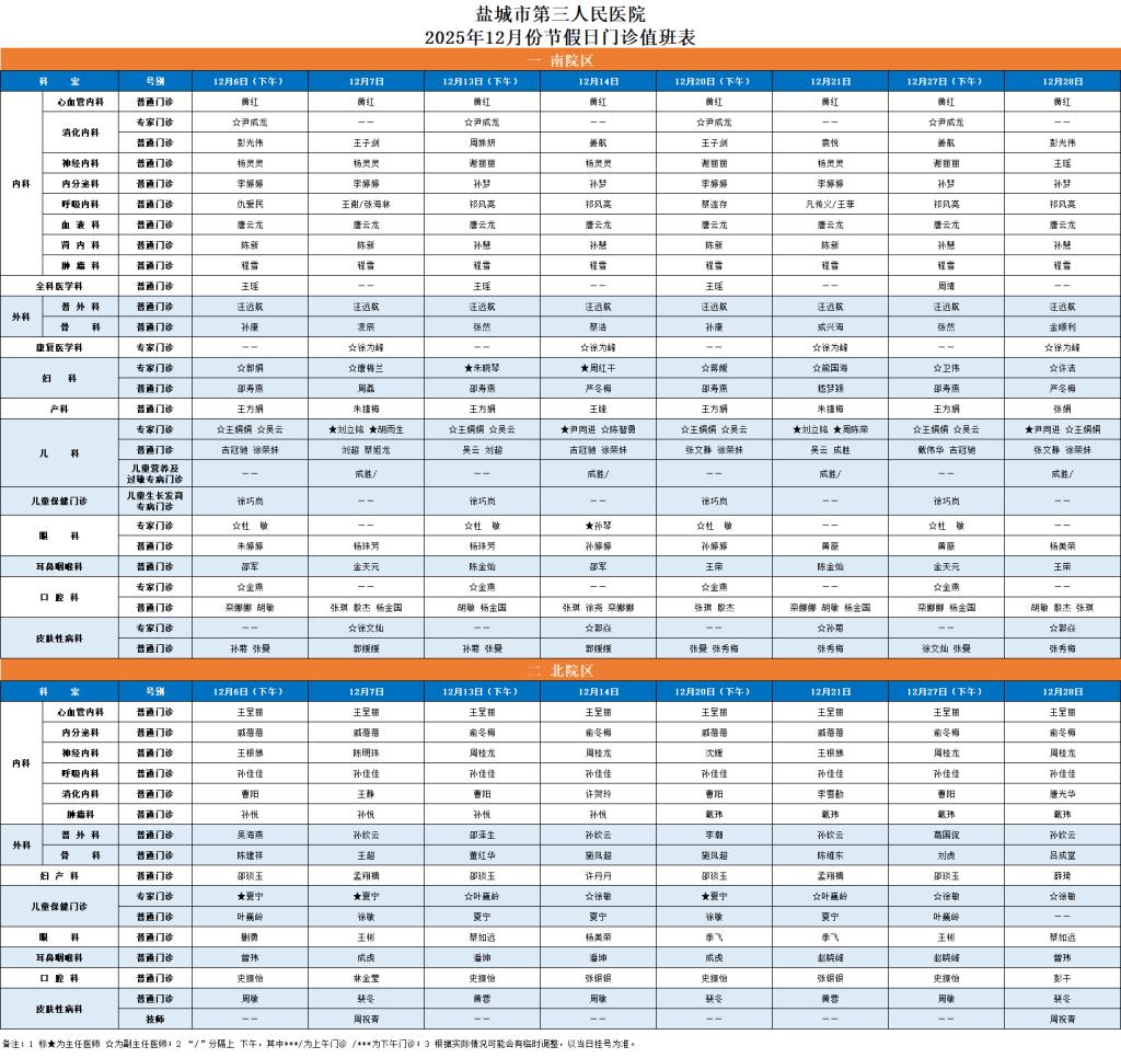 专家门诊排班表 首页 > 就医指南 > 门急诊指南 > 门诊排班 > 专家门诊排班表 联系方式: 门诊一站式服务台: 0515-81600080(南院区) 0515-81608266(北院区) 敬老专线: 0515-81602286(南院区) 0515-81608123(北院区) 地址: 盐城市新都西路2号(南院区) 盐城市剧场路75号(北院区)